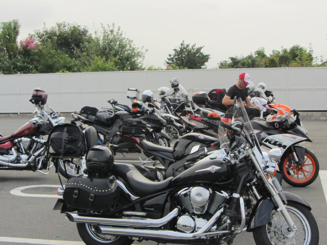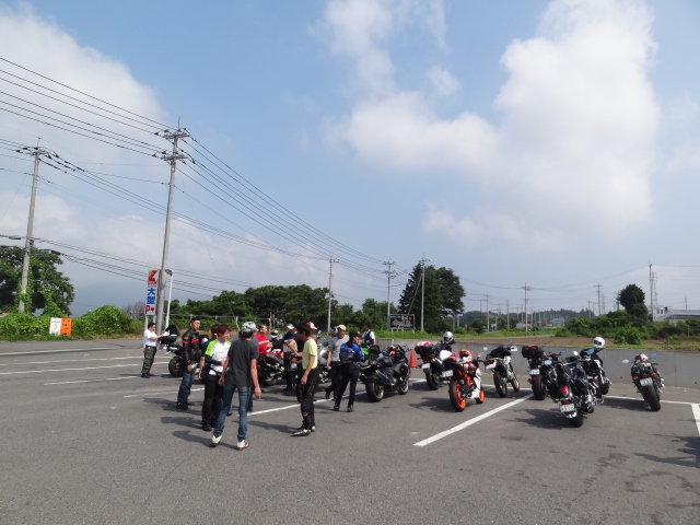 早朝の嵐山PAにレディース3名集合。後、まさ・パチも合流し第一集合場所に向かう。伊勢崎セブンイレブンでは、すでにほとんどのメンバーが待っていました。ゲストさん2名も合流しました。間もなく、ご隠居様がオフ車にてサプライズ登場。これで全員・・・あれ?ヒロさんが居ない!どうした?と噂していたらギリギリ参上。6:30にお目覚めしたそうです。「幹事の遅刻」をまぬがれましたね。全員揃ったところでサクサクッと朝のご挨拶をし、ご隠居様・まささんに見送られ総勢15名15台のマシンでツー・出発です。