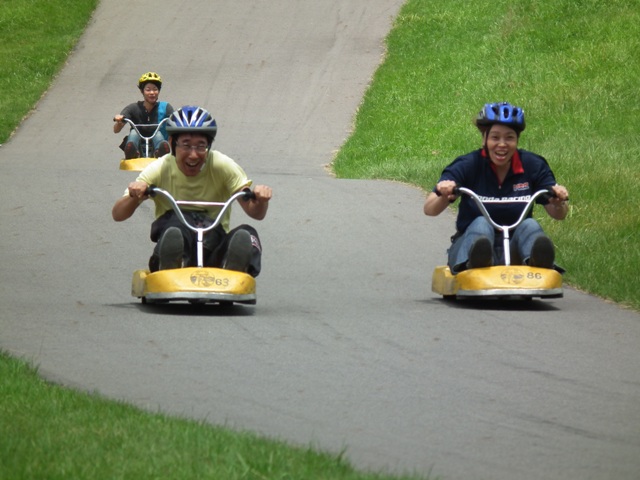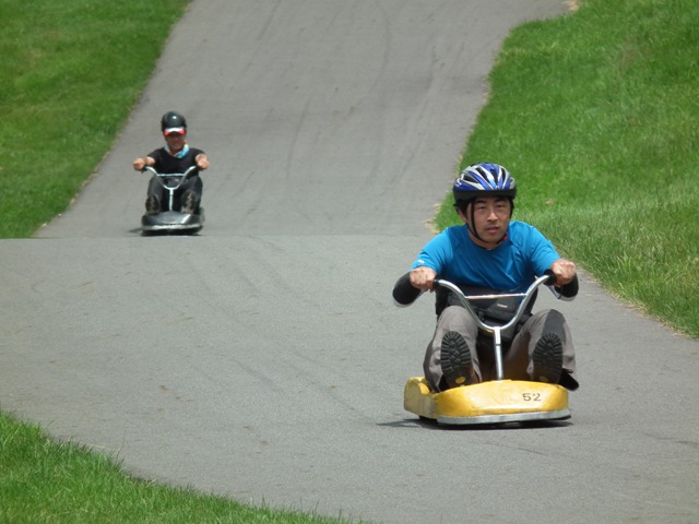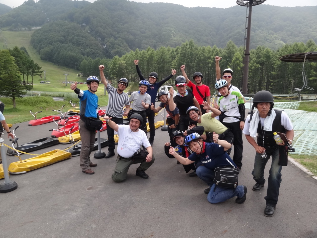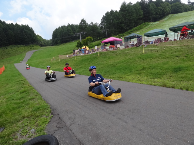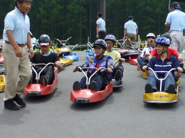 R120~丸沼高原へと走ります。流石に身体に当たる風は涼しく爽快な道のりでした。丸沼高原に到着し、メインイベントの「サマーリュージュ」に!3回券を購入し、いざ出陣。リフト券付で1回500円、中々リーズナブルな価格であります。リフトに乗って上まで行き、リュージュ操作説明を受けGO! 7~8名に分かれてのスタート。ライダーだけあって相当なスピードで下る各メンバー。ヒートアップした方はコースアウトあり、童心に帰り楽しみました。