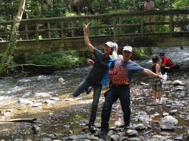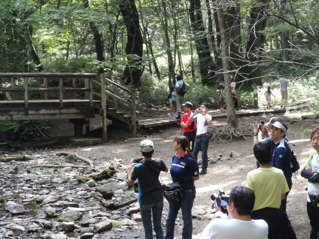 一休みし、再出発。金精峠~湯滝へと向かいました。このルートも非常に涼しく下界の猛暑を忘れさせてくれました。そして湯滝に到着。何度も日光には来ていますが、この場所はお初の観光です。想像していたよりも壮大で水量あり、迫力があり感動した~。滝見学・水辺での自由行動。石を裏返してナニかを探しているメンバー・・・そんな所には「ポケモン」居ませんよね? 森林浴も兼ねての見学となり各自リラックスしたのではないかと思います。