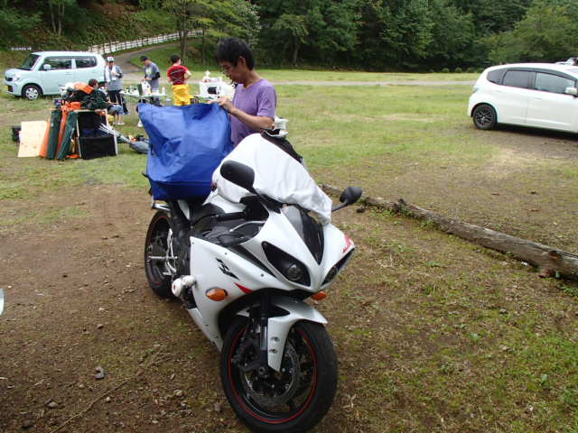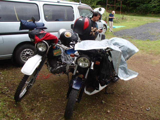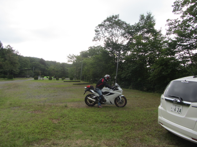 バイクと荷物を置いてテントサイトに、ちょっと離れているので車で移動。