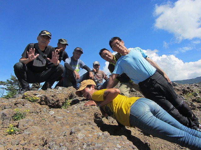 息も絶え絶えに兜巾の岩によじ登り記念写真。