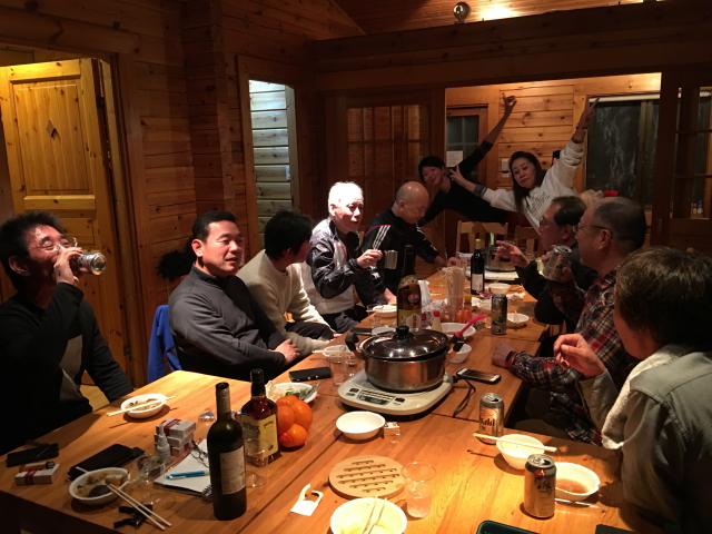 宴が盛り上がる中、お仕事終えた嵐蔵さんが到着し、これで全員集合、改めて乾杯。